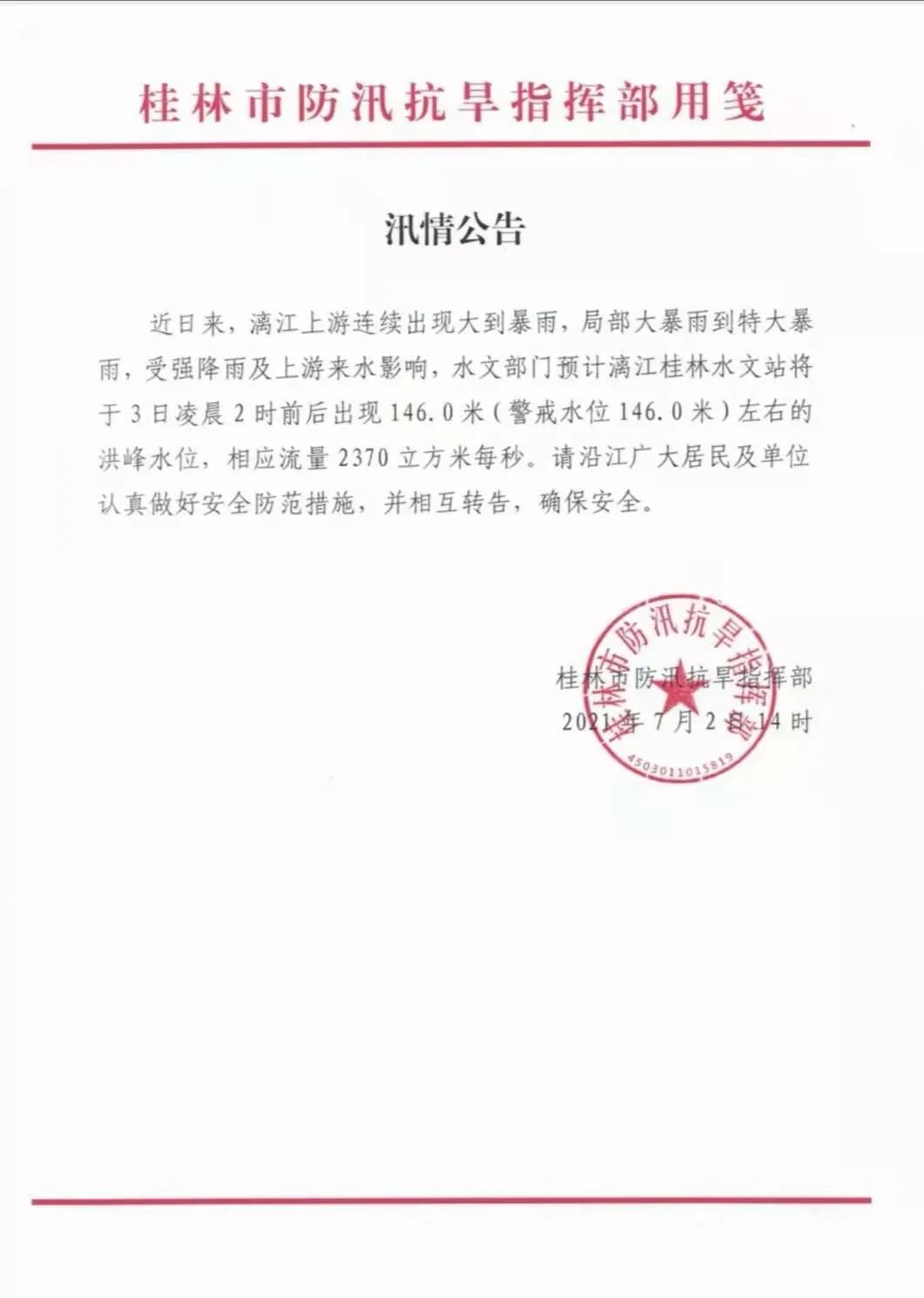 桂林水文中心桂林水文中心站又于13时00分发布洪水蓝色预警:受持续强降雨及上游来水影响,预计未来8~17小时,漓江城区河段(警戒水位146.00米)至草坪河段(警戒水位131.50米)将出现警戒水位左右的洪水,桂林水文中心站于2日13时00分发布洪水蓝色预警,提请解放桥等桥梁下穿通道、象山景区、六匹马码头、冠岩景区等沿河有关单位和社会公众加强防范,及时避险。