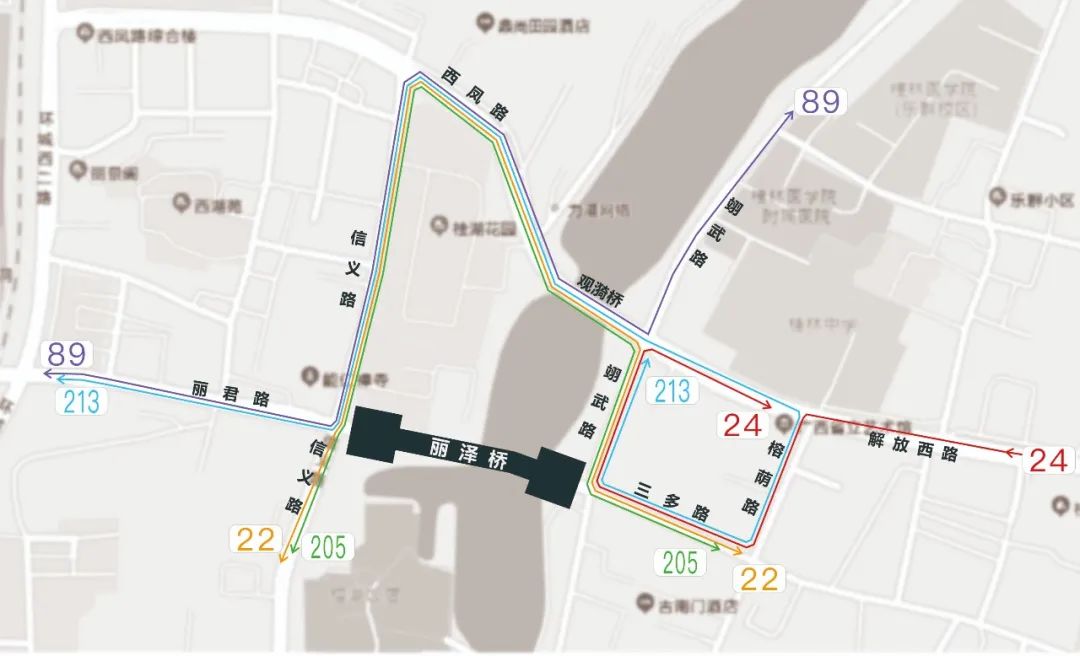 三、89路、205路绕行信义路、西凤路、观漪桥,反向同步调整;213路绕行信义路、西凤路、观漪桥、解放西路至艺术馆站,反向同步调整。89路、205路、213路3条线路无站点调整。