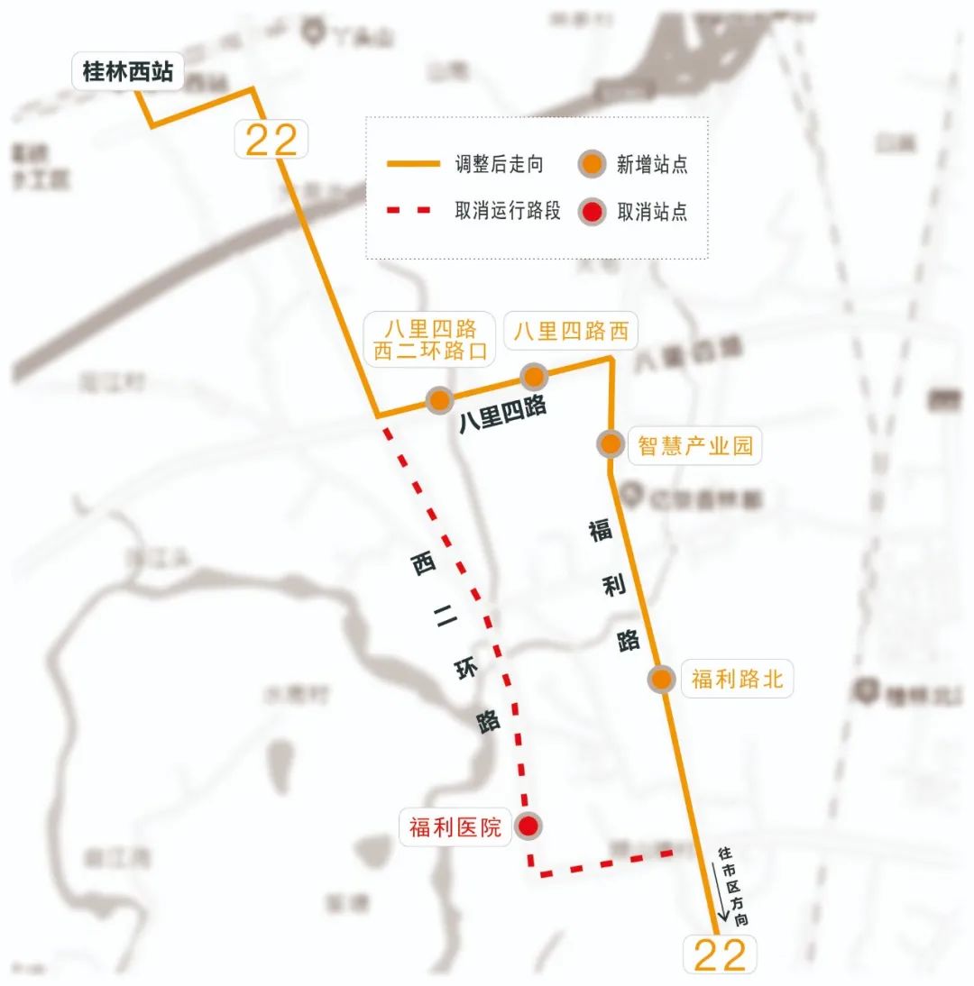 (三)站点设置如下:天鹅塘→桂林站→南门桥南(魅力花园养老公寓)→西门桥→少年宫→信义丽君路口→丽泽桥→十字街(解放西路)(反向停)→乐群路口(正向停)→四会路(反向停)→宝贤桥→西清湖→观音阁→芦笛路→九华山→圣隆路→圣隆路北→胜利路三巷口→铁路菜市→福利路南→救助站(反向停)→福利路北→智慧产业园→八里四路西→八里四路西二环路口→社塘村→大泉水村→桂林西站。22路行车示意图