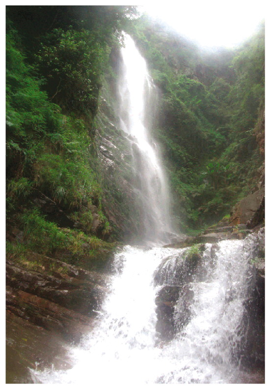 这是个天然形成的瀑布。瀑布分3层,第一层瀑布高三四米,宽4米,瀑布自悬崖上飞扬而下,激起水花飞溅,雾气弥漫,从上而下飞溅而来的水滴,轻轻地洒落在身上,让人心旷神怡。
