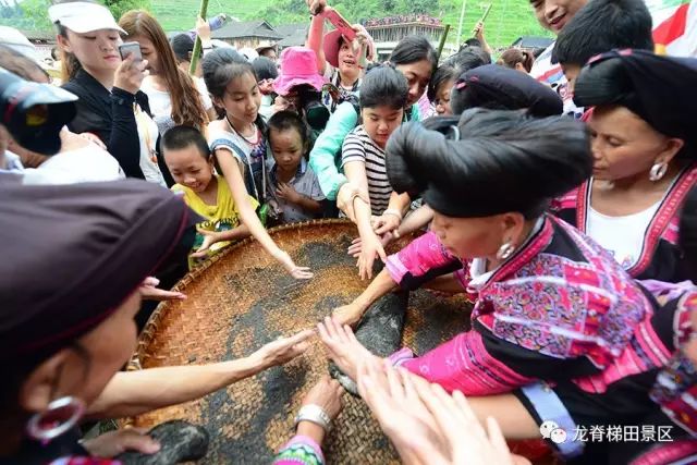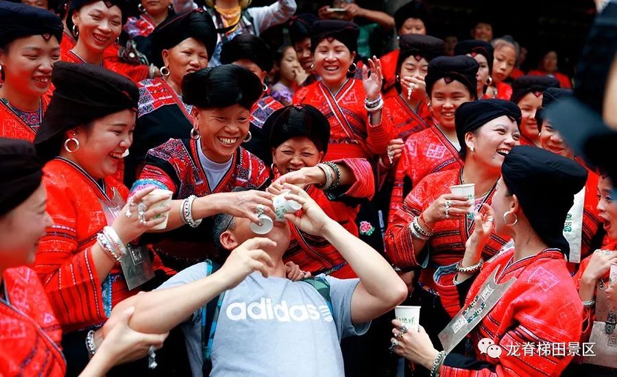 村寨里的姑娘和嫂子们手捧酒杯唱着欢快的敬酒歌,向远道而来的各位贵客敬上一杯香甜的龙脊水酒。