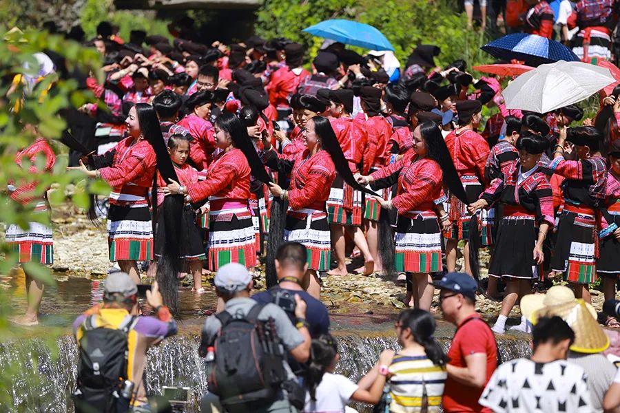 红瑶妇女有从小开始留长发的习俗,世代相传。红瑶有"三怪":“头发当草帽戴、手镯当耳环戴、衣服全是丝线带”。这三怪就是红瑶本民族标志性的特征。长发在红瑶象征着长命富贵。当天,村寨中的红瑶女身着艳丽的红瑶服饰,不约而同的来到河边上梳理自己的长发,把自己最美的一面展现出来。