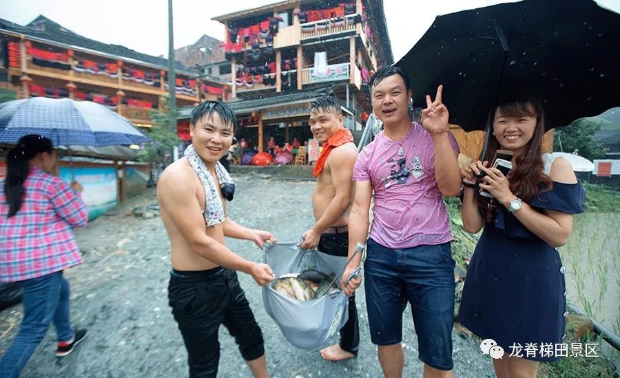 旁边的田一群红瑶村民穿着蓑衣戴着斗笠围在河边敲锣打鼓,田中的鱼偷偷的探出脑袋,村民与游客纷纷挽起裤脚光着脚丫子下河摸鱼,全寨欢庆。