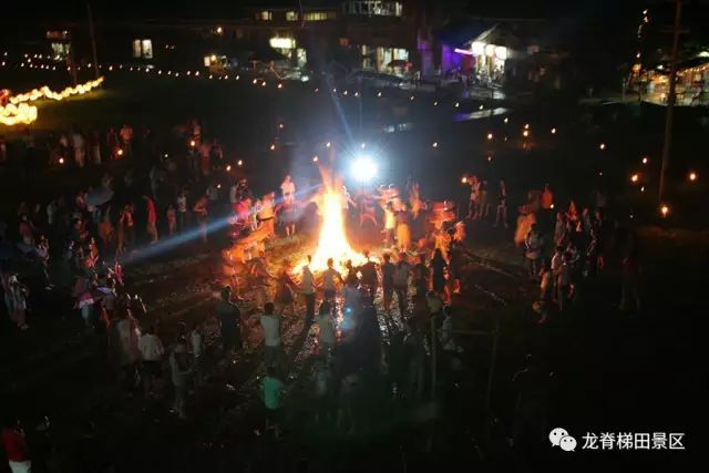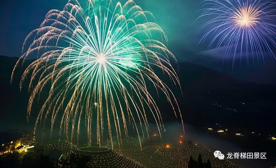 夜色渐暗梯田上的火把逐渐汇集起来,构成一幅“神龙”及“龙脊梯田”字样的美丽画面,绚丽多彩。梯田上空放起了烟花,刹时,烈焰腾空,响彻云霄,场面壮观。