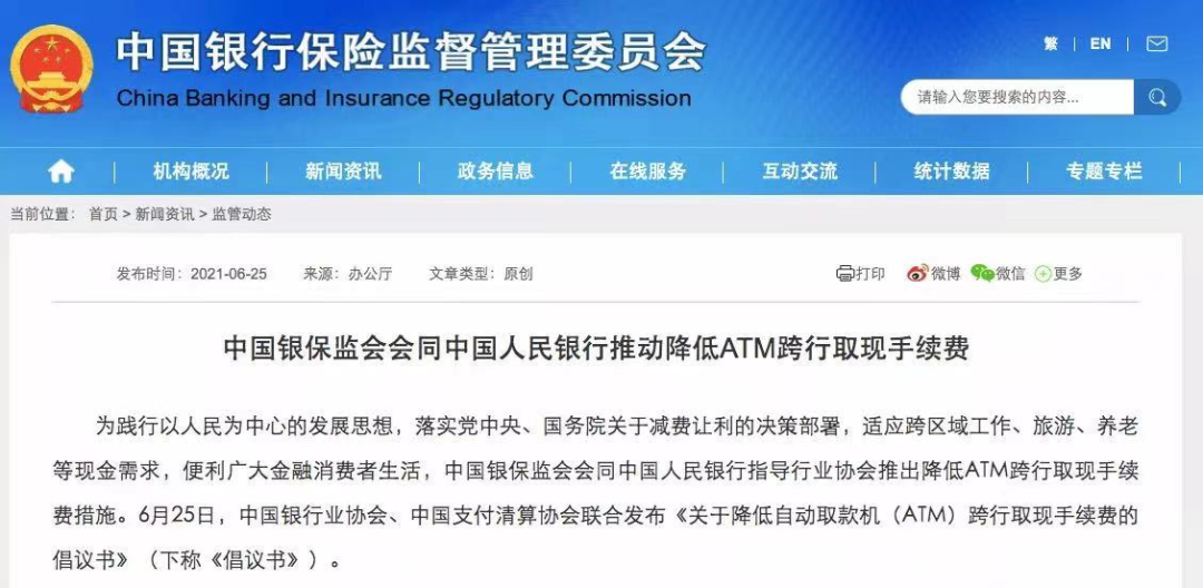 6月25日,中国银行业协会、中国支付清算协会联合倡议,同城ATM跨行取现手续费标准下调至每笔不超过3.5元;取消异地取现手续费按取款金额一定比例收取的变动费用,固定费用与同城业务标准一致。