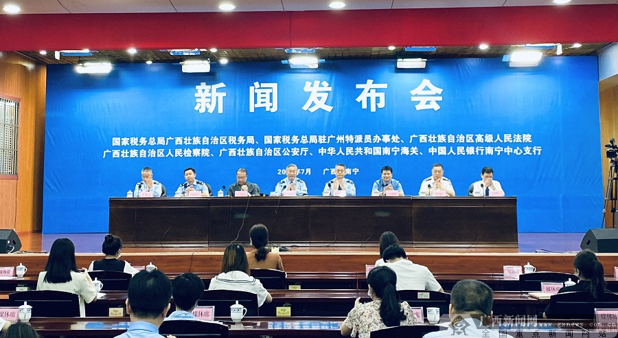 广西新闻网南宁7月15日(记者 黄诗淇 麦一帆)为严厉打击虚开骗税违法犯罪行为,震慑违法犯罪分子,引导广大纳税人和社会公众提高遵从税法的自觉性,营造协税护税的良好氛围,优化广西营商环境,国家税务总局广西壮族自治区税务局、国家税务总局驻广州特派员办事处、广西壮族自治区高级人民法院、广西壮族自治区人民检察院、广西壮族自治区公安厅、中华人民共和国南宁海关、中国人民银行南宁中心支行于7月15日在国家税务总局广西壮族自治区税务局园湖办公区,联合召开2021年广西打击虚开骗税违法犯罪两年专项行动新闻发布会,公开曝光近两年广西查处的10起虚开骗税违法犯罪典型案件。