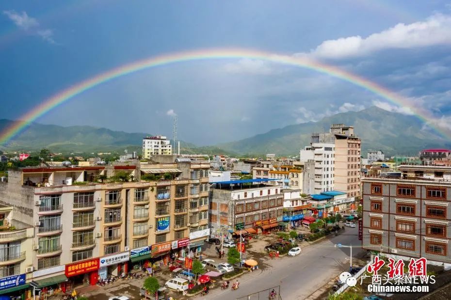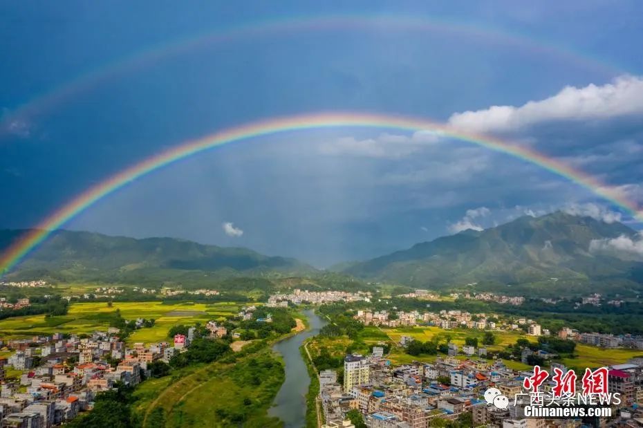 7月7日,农历小暑节气,广西梧州市苍梧县沙头镇乡村上空出现彩虹美景,整个乡村田野在彩虹的映衬下,美如画卷。何华文 摄