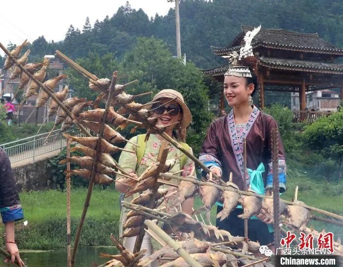 游客和少数民族姑娘一起烤鱼 石峰 摄