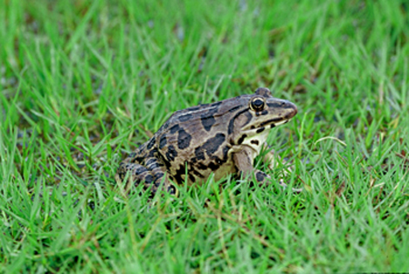 虎纹蛙(Hoplobatrachus rugulosus)虎纹蛙又叫水鸡,它的个头长得魁梧壮实,有"亚洲之蛙"之称。雌性比雄性大,体长可超过12厘米,体重250~500克。皮肤较为粗糙,头部及体侧有深色不规则的斑纹。背部呈黄绿色略带棕色,有十几行纵向排列的肤棱,肤棱间散布小疣粒。腹面白色,也有不规则的斑纹,咽部和胸部还有灰棕色斑。前后肢有横斑。由于这些斑纹看上去略似虎皮,因此得名。趾端尖圆,趾间具全蹼。前肢粗壮,指垫发达,呈灰色。雄蛙具外声囊一对。分布范围较广,中国在江苏、浙江、湖南、湖北、安徽、广东、广西、贵州、福建、台湾、云南、江西、海南、上海、河南、重庆、四川和陕西南部等地均有分布,在国外还见于南亚和东南亚一带。