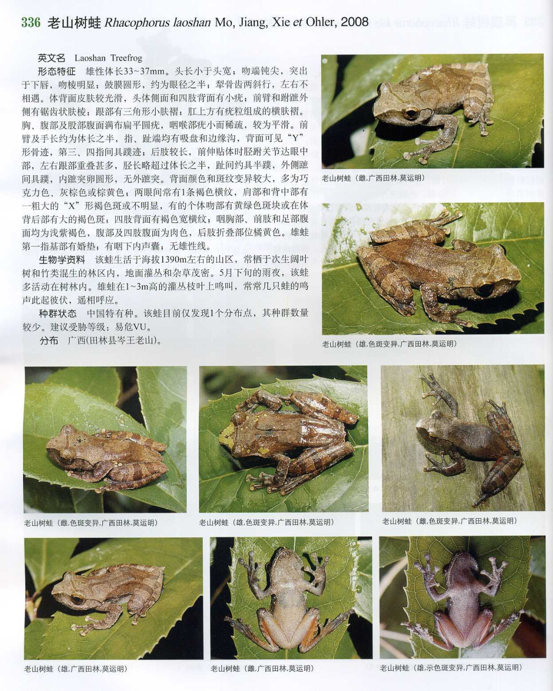 老山树蛙(Rhacophorus laoshan)本种与疣足树蛙相近,前臂和跗蹠外缘具齿状肤突,跟部上方有三角形小肤褶。但本种两眼间有一褐色横纹;指间约具蹼迹。国内分布:广西(田林岑王老山)。