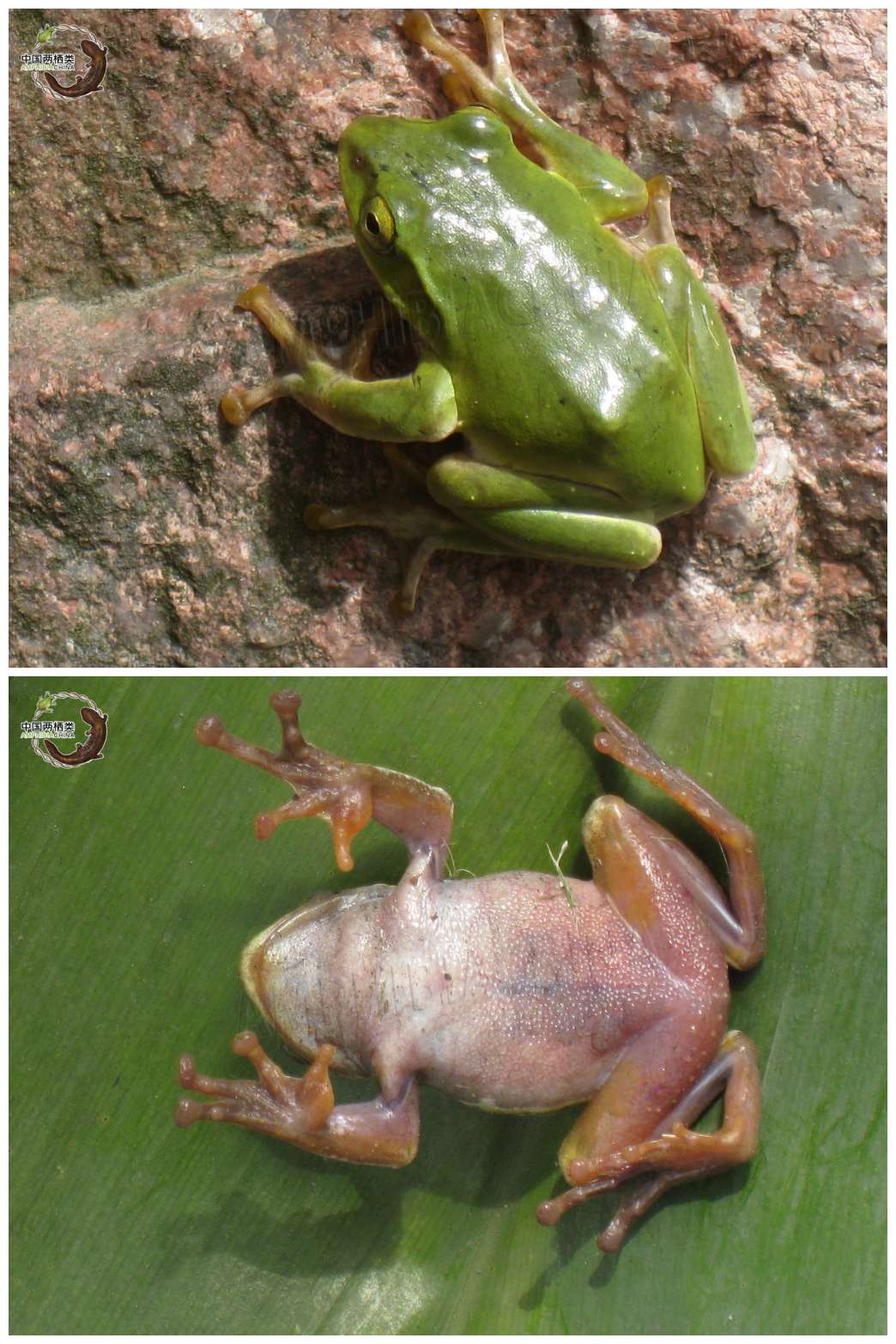 巫溪树蛙(rhacophorus hongchibaensis)体型特征 :头宽略大于头长;体和四肢背面皮肤有小疣;体腹面及股部腹面密布扁平疣,咽喉部疣粒较小。体和四肢背面浅绿色,具浅褐色大小斑点,斑点的边缘为深褐色;腹面乳白色,略显灰褐色小斑点或呈云斑状。地理分布:重庆巫溪