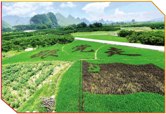 在灵川县农业局专家的指导建议下,甘草村今年开始尝试转产,现共种植有150亩优质水稻。村民以稻田做画布,在当中勾画出了“跟党走”和“党旗”图案。在转产的同时,也将稻田打造成可供游客拍照的新“打卡”点。