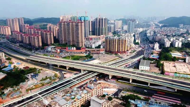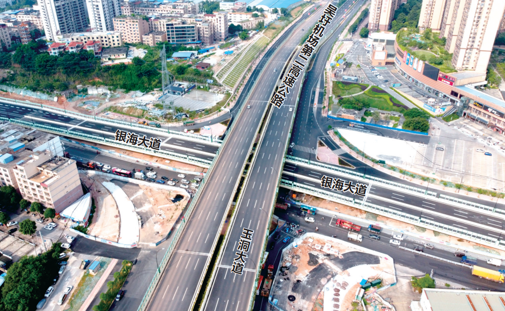 银灯立交银海大道跨线桥梁主线通车(下穿立交为银海大道)。记者 赖有光 摄