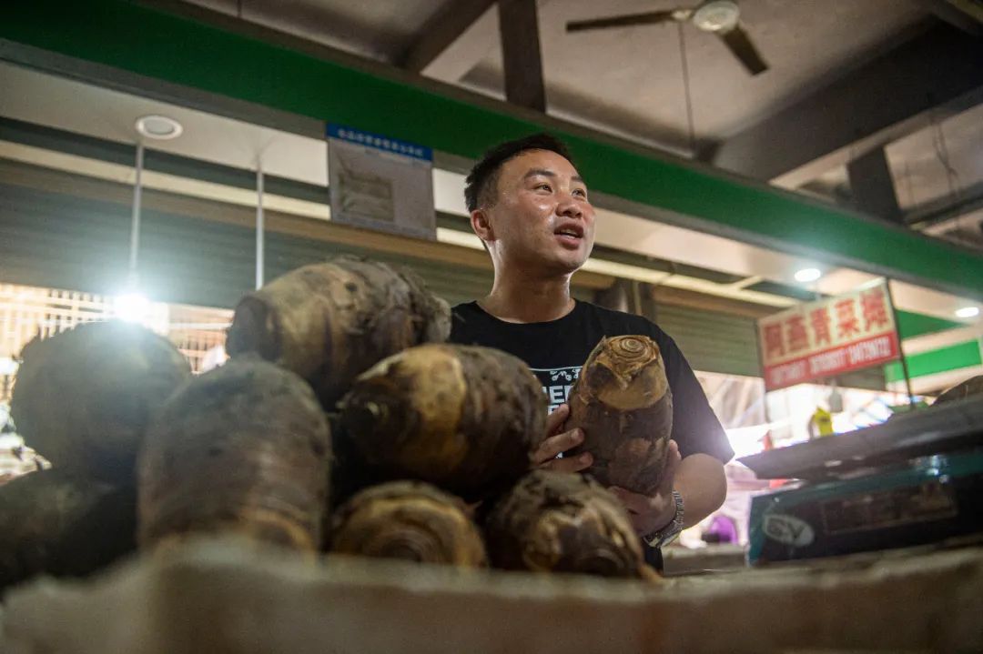 前几天一大早,熙熙攘攘的荔浦市中心市场,荔浦人黄学科走在人群中,朝他热情打招呼的人络绎不绝。市场里,有一家芋头摊位打出他的招牌——“黄家酒席指定荔浦芋供应商”。名气,很大一部分来自于当地特色名菜——荔浦芋扣肉。今年不过30岁出头的黄学科,是这道自治区级非遗美食的市级传承人。