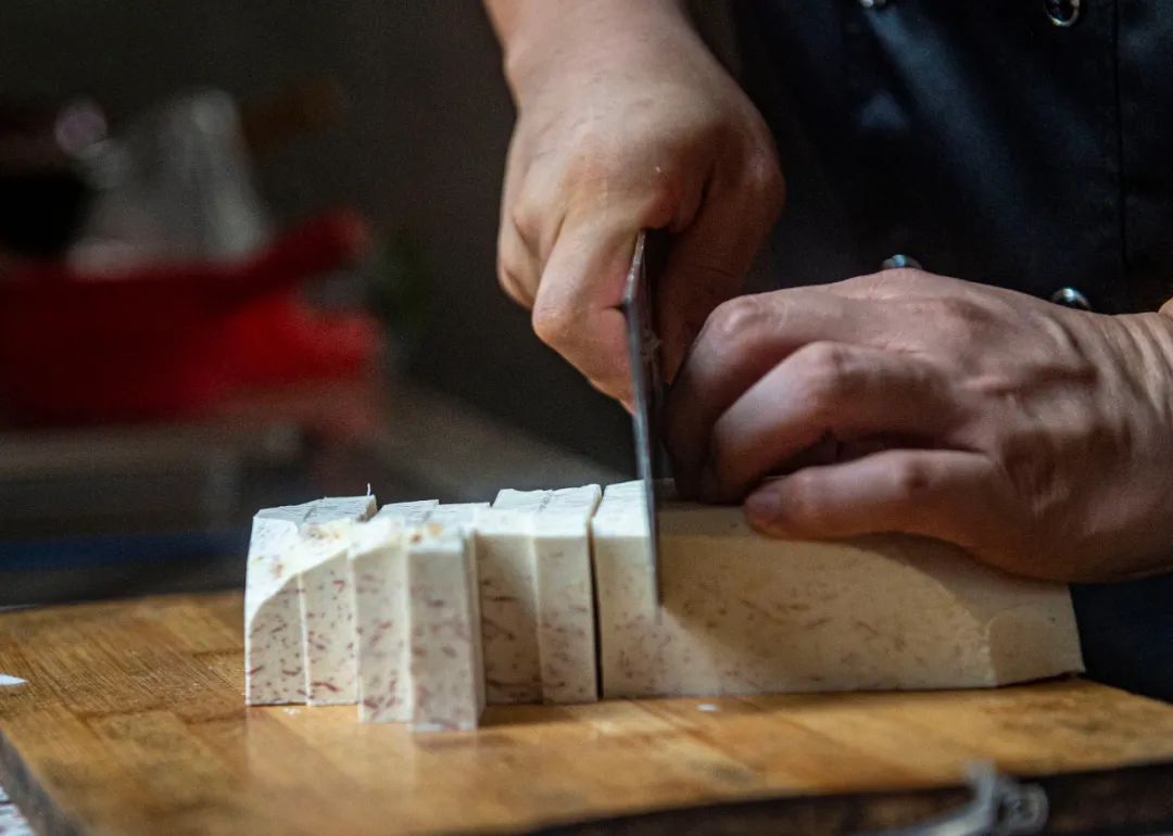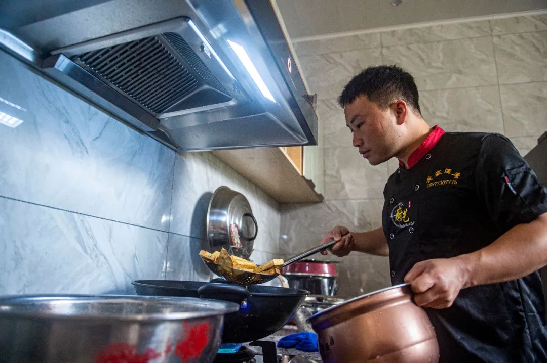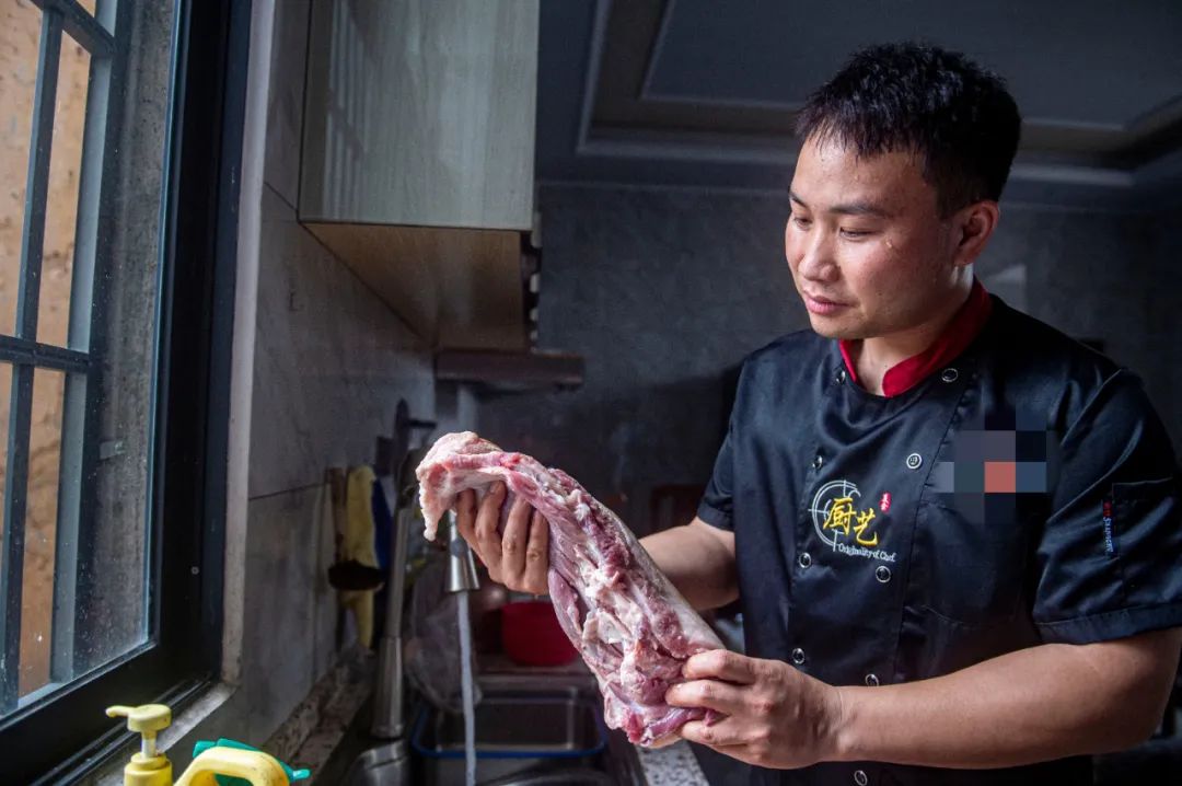 90后的黄学科退伍后,他曾到柳州开餐馆,然而,一年后,他带着失意回到荔浦。在偶然跟朋友交谈中,他发现农村酒席市场一般是村里的厨头负责牵头。于是,他有了从事农村酒席一条龙服务的想法,在当地农村酒席菜肴中,荔浦芋扣肉是重中之重。而其制作技艺在荔浦家家户户广为传承,40岁以上的本地人几乎没有不懂制作荔浦芋扣肉的。黄学科从小在家人制作荔浦芋扣肉的过程耳濡目染,再就加上跟当了多年厨头的伯爷学习,他掌握到制作的精髓。