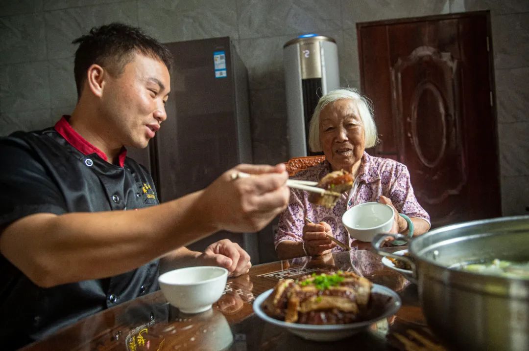 忙乎了一个早上,黄学科和家人们围坐在餐桌前,他把芋头和扣肉一起夹起,放进奶奶的碗里,“奶奶,你吃下我今天煮的,看看味道怎么样?”奶奶端着碗,趁热尝了一口,“好吃,你现在做这道菜越来越好吃了。”