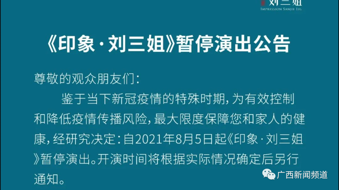 记者了解到,桂林的山水实景演出《印象·刘三姐》已于8月5日起暂停演出。原定于8月13日在广西戏剧院桂戏坊上演的桂剧《校长爸爸》延期至10月15日演出。原定于8月20日、21日在南宁剧场上演的明星话剧《断金》,以及原定于9月2日上演的英国经典闹剧《演砸了》中文版均取消演出。
