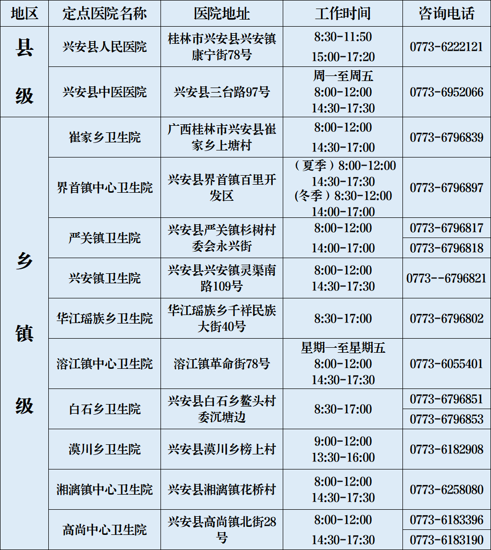 灵川镇卫生院工作时间:周一至周五8:00-12:00,14:30-17:30办理科室:综合科门诊咨询电话:0773-6813823