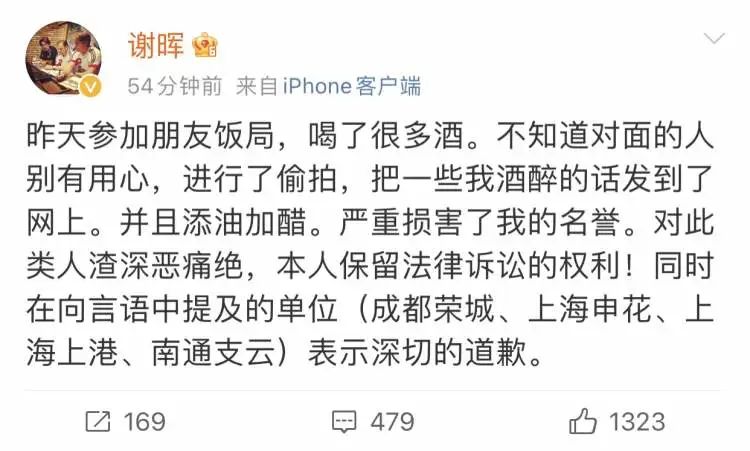 此前谢晖酒后言论被人偷拍后在网络发酵