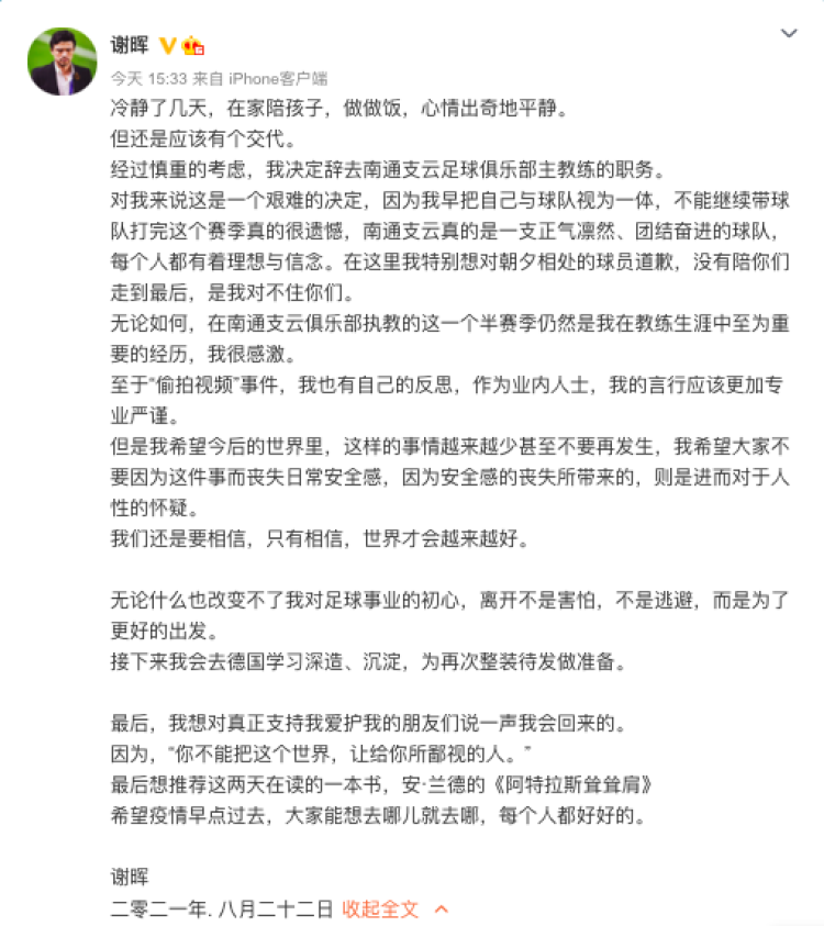8月22日,事件又有新进展下午,谢晖在微博上表示决定辞去南通支云队主教练的职务然后会去德国学习深造提升自己的足球业务能力 ↓↓↓