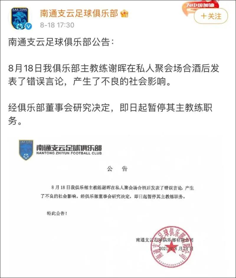 之后,南通支云俱乐部发布公告,“因在私人聚会场合酒后发表错误言论,造成了不良社会影响,即日起暂停其教练职务。”