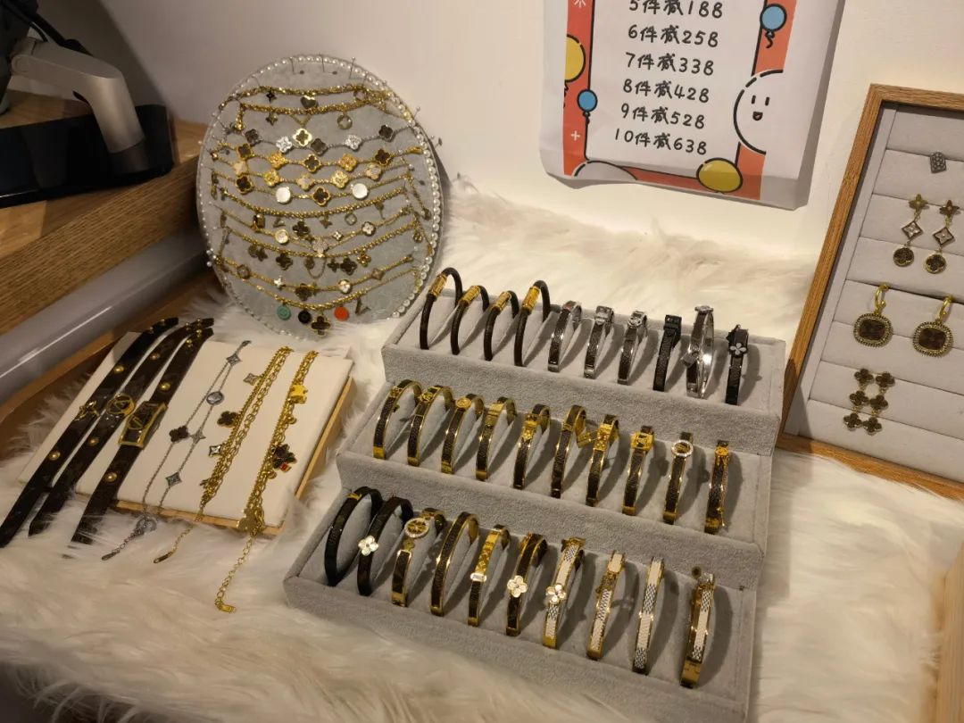 商家称,盲盒中包含着发卡、戒指、钥匙扣、手镯、项链、卡包、玩偶等物品,这些物品同时也在店里售卖,价格在128元-598元不等。