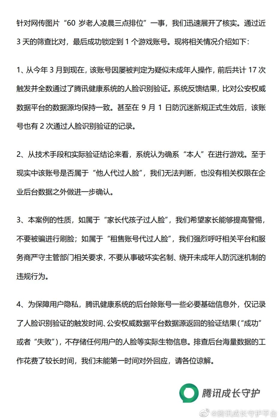 今天,@腾讯成长守护平台回应:关于网传图片“60岁老人凌晨三点排位”一事,我们高度关注,并迅速开展了核实工作,经过近3天的筛查比对,最后成功锁定到1个游戏账号。现将相关情况介绍如下: