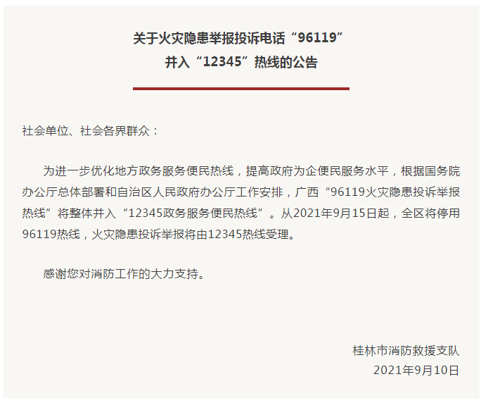 公告中说,根据国务院办公厅总体部署和自治区人民政府办公厅工作安排,广西“96119火灾隐患投诉举报热线”将整体并入“12345政务服务便民热线”。从2021年9月15日起,全区将停用96119热线,火灾隐患投诉举报将由12345热线受理。此举的目的在于进一步优化地方政务服务便民热线,提高政府为企便民服务水平。