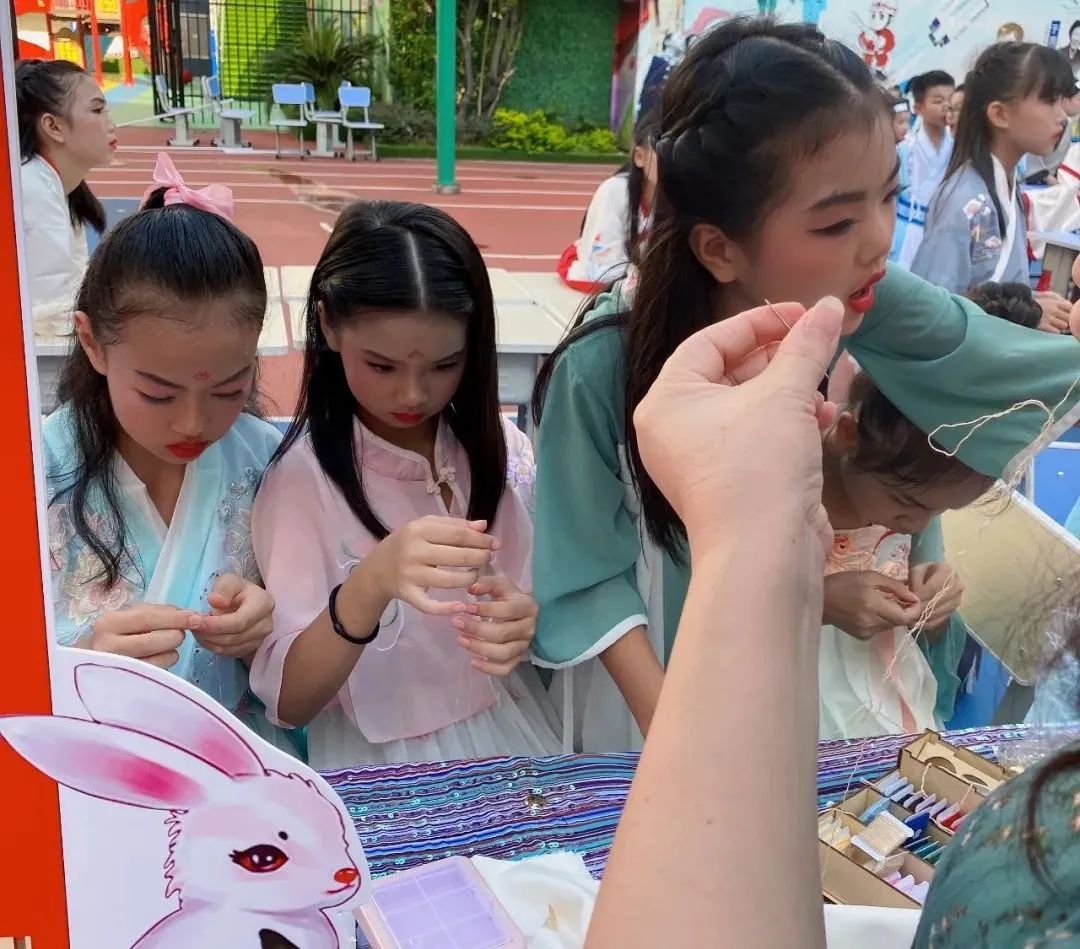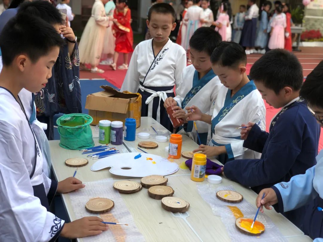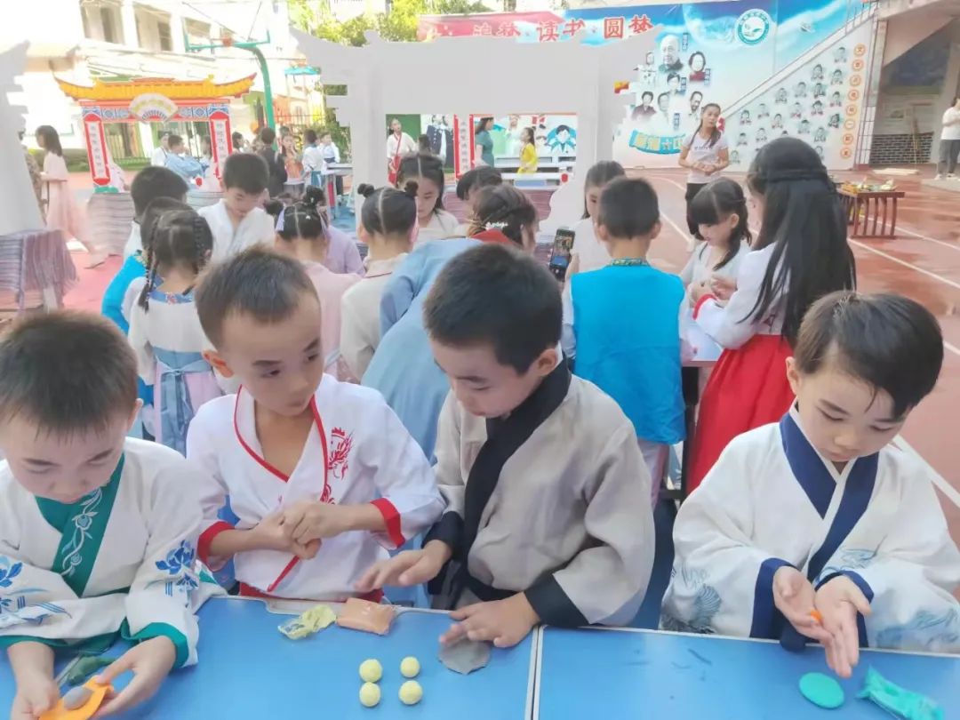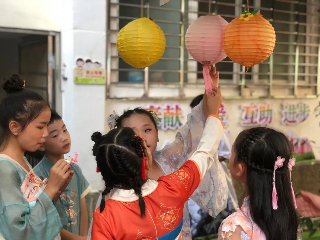 活动在从游园开始,全校师生身着汉服款款走过,随后大家重温作揖之礼。现场还开展了丰富多彩的庆祝活动,猜灯谜、着汉服、学礼仪、做灯笼、做手链、绘画、刺绣、制作手链、捏陶泥等等,让整个校园充满了欢声笑语,孩子们乐在其中。