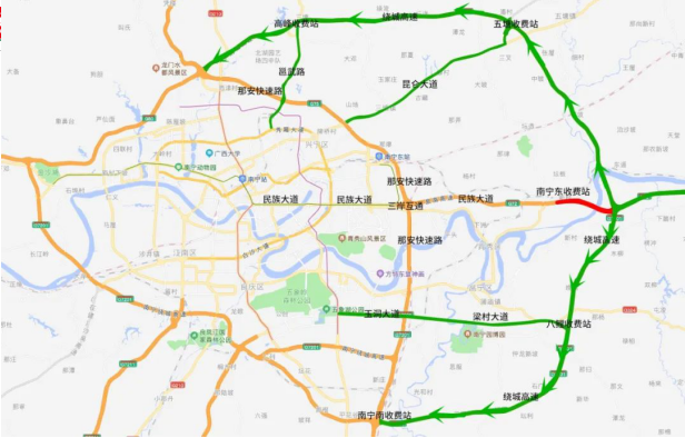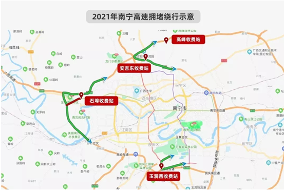 进城:可选择绕开石埠收费站,从安吉东、高峰、玉洞西收费站进入南宁市区。