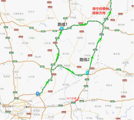 (2)柳州、桂林往南宁方向的车辆路线1:可以选择三柳高速→S31三南高速(新柳南高速)前往目的地。