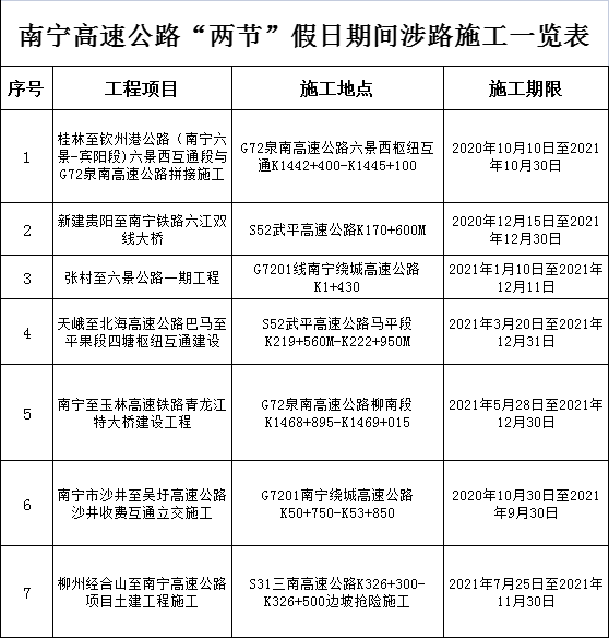 1.G75兰海高速安吉至伊岭岩路段、府城至武鸣路段。2.G80广昆高速石埠至坛洛路段。3.G72泉南高速那容至伶俐服务区路段、兴六互通路段。4.G7201南宁环城高速石埠北立交路段。