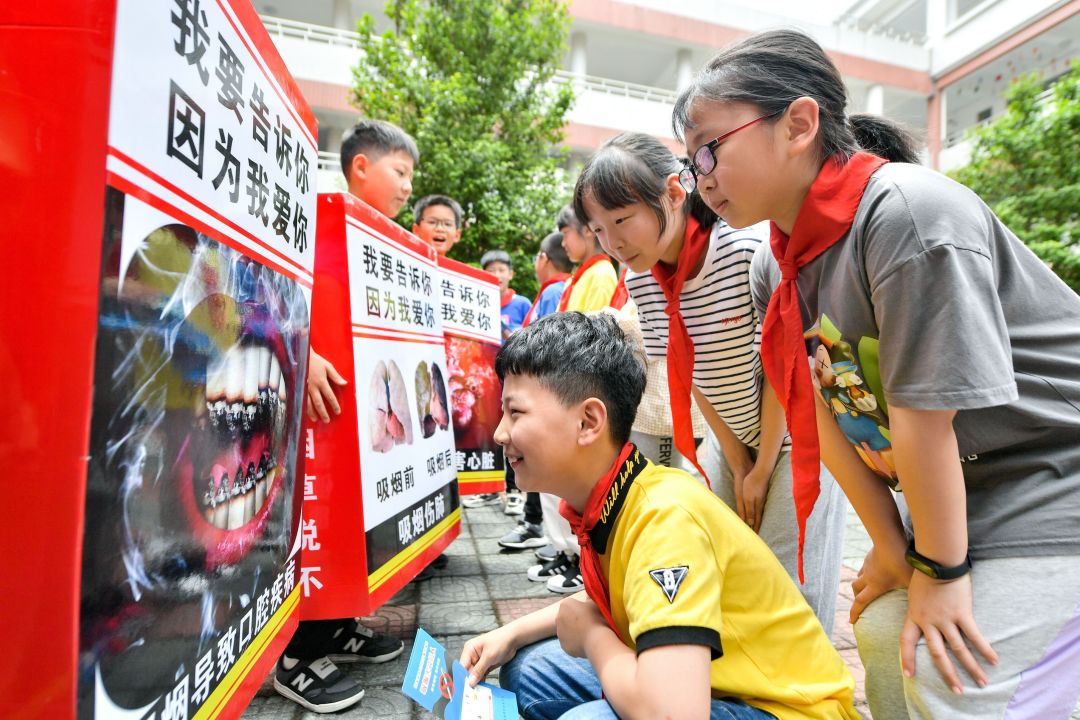 ▲5月27日,浙江省湖州市长兴县实验小学,孩子们正在戒烟烟盒真人秀活动上了解吸烟危害。图/IC photo