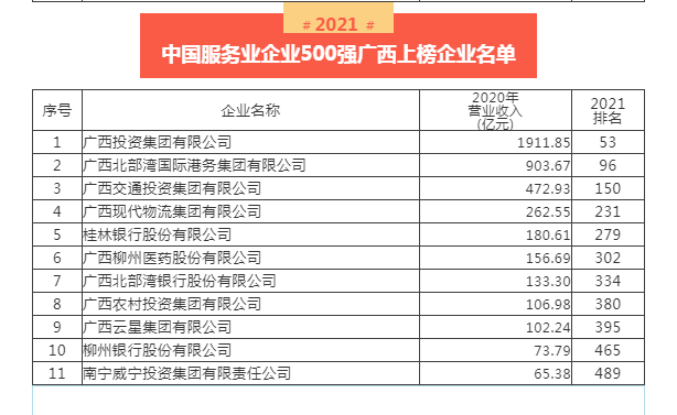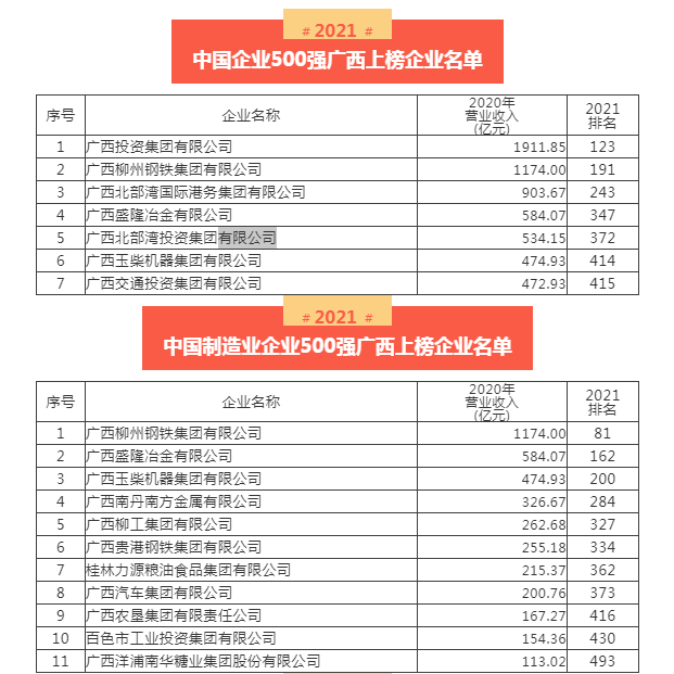 广西有11家企业入围2021中国制造业企业500强,11家企业入围2020中国服务业企业500强。