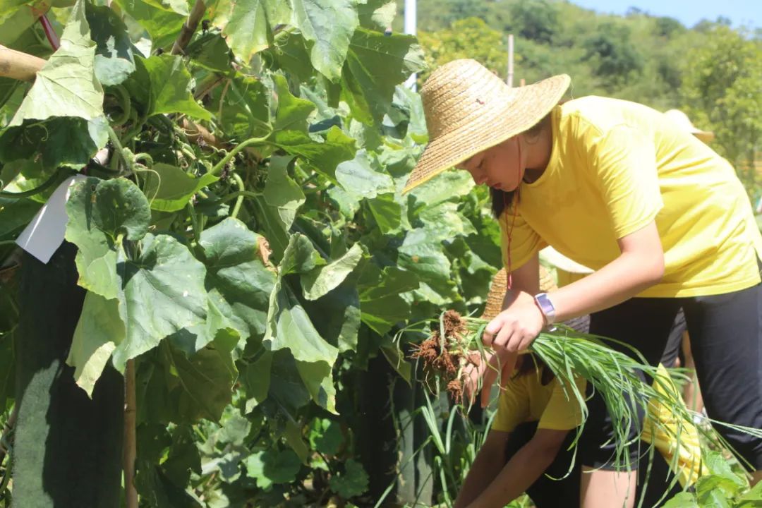 在室外劳动实践区,德智外国语学校高一5班的同学们头戴草帽,在烈日下用锄头翻新一片准备种植蔬菜的坡地。“把劳动课搬到田间地头,让我真正感受了劳动的艰辛。”被太阳晒得满脸通红的张涵玉同学说。