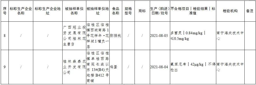 (五)临桂区“广西冠业投资发展有限公司桂林花生唐店”销售的猕猴桃,多菌灵含量不符合食品安全国家标准规定。检验机构为:南宁海关技术中心。