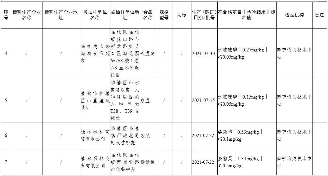 (二)临桂区“桂林市临桂区山里娃蔬菜店”销售的豇豆,水胺硫磷含量不符合食品安全国家标准规定。检验机构为:南宁海关技术中心。