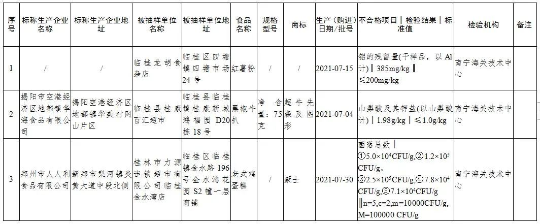 (一)临桂区“临桂龙胡食杂店”销售的红薯粉,铝含量不符合食品安全国家标准规定。检验机构为:南宁海关技术中心。