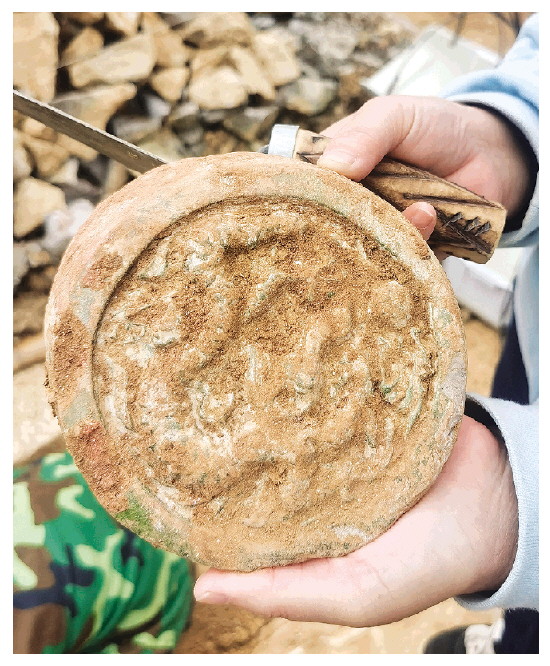 记者在现场看到,墓室外神道两侧石狮、石像排列整齐。一根望柱横在神道一侧。考古人员正在对陵墓的地面建筑进行考古清理,瓦当是工地中发掘出来的最常见的建筑构件。在现场,记者就看到了这种本应安放在享殿屋顶的构件。考古人员告诉记者,瓦当上的龙形纹饰带有明显的明代特征;瓦当安放在屋顶的最外沿,下雨时,雨水顺着屋顶流到这里,然后落到地上。记者看到这块瓦当虽然颜色很不起眼,但是细腻的触感仍能让人感觉到其制作工艺的精湛。