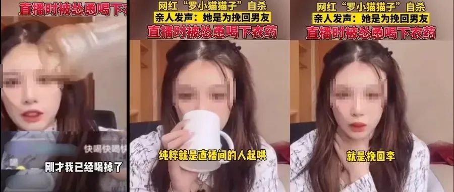 罗小猫猫子家人说:农药其实是兑了饮料了,其实她并不想死,只是想要通过自杀的方式挽回李某,真的喝下去纯粹就是直播间的人起哄,后续的120、110也是她自己打的。
