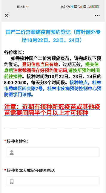 预约成功者请在预约接种日,持本人有效身份证及手机成功预约码截图,到桂林市疾病预防控制中心预防医学门诊(桂林市秀峰区四会路7号)进行接种。接种名额仅限本人,不得转让!过期自动作废。 在我中心门诊接种过首针或第2针二价HPV疫苗的女性朋友,后续针次不需预约,到接种时间可直接前来接种。