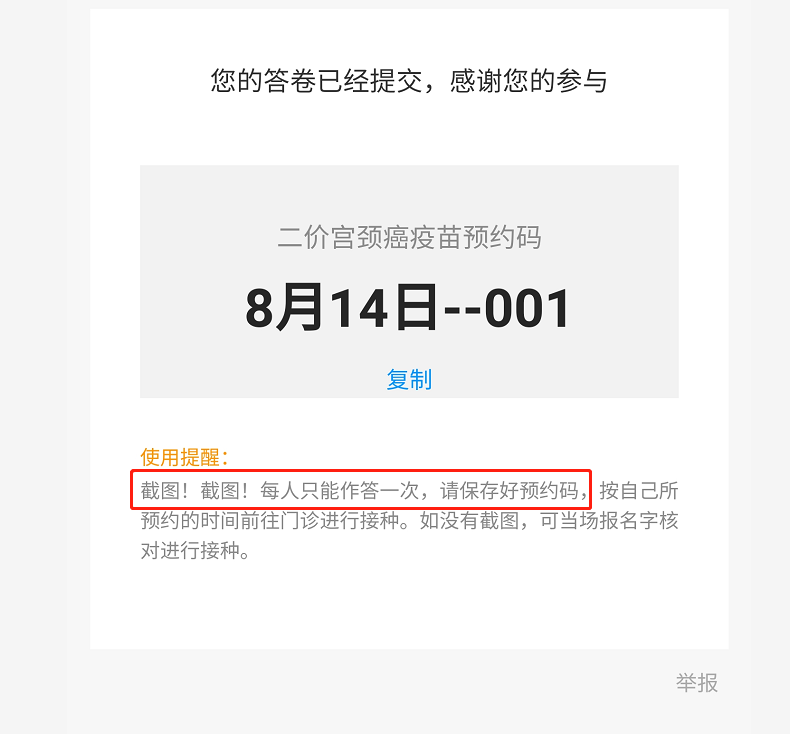 预约成功,请务必截图保存预约码!如未截图保存预约码,可在预约成功接种当日前往中心门诊报名字,经核实无误即可接种!