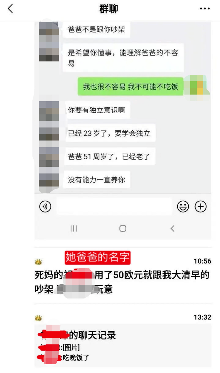 之后,女儿还在一微信群内发了辱骂自己父亲的内容,“用了50欧元就大清早跟我吵架的恶心玩意”。