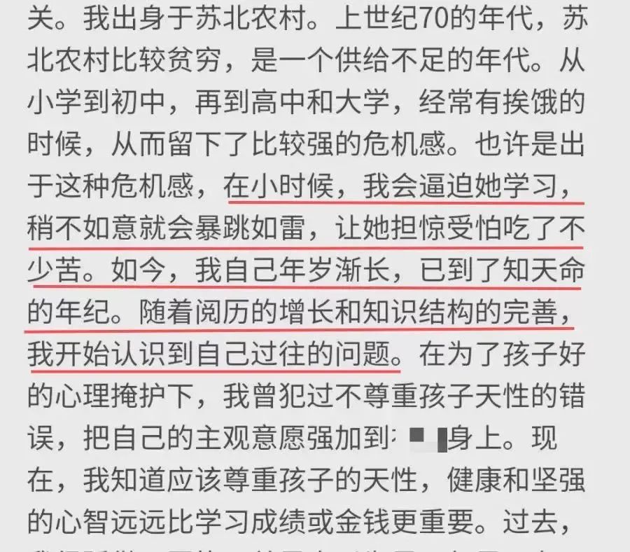 他认为可能是自己在农村长大、生活贫穷、危机感强有关,所以有意无意地将自己的意愿强加在了女儿身上。