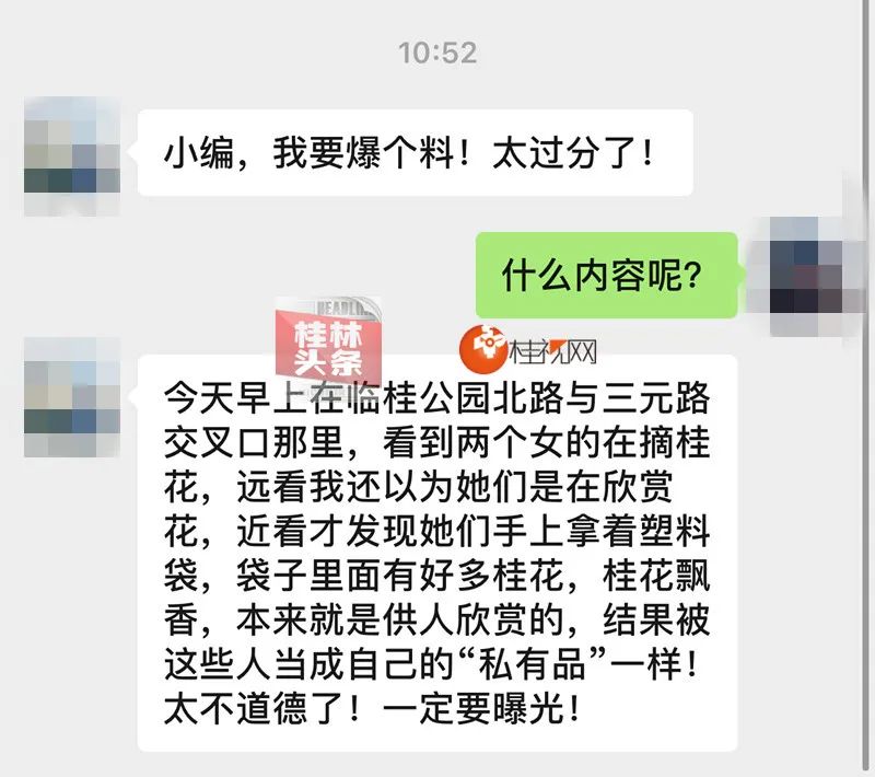 爆料网友表示,这样的行为太不道德了,桂花本来就是供市民欣赏的,却被这些人任意采摘变成“私有品”。