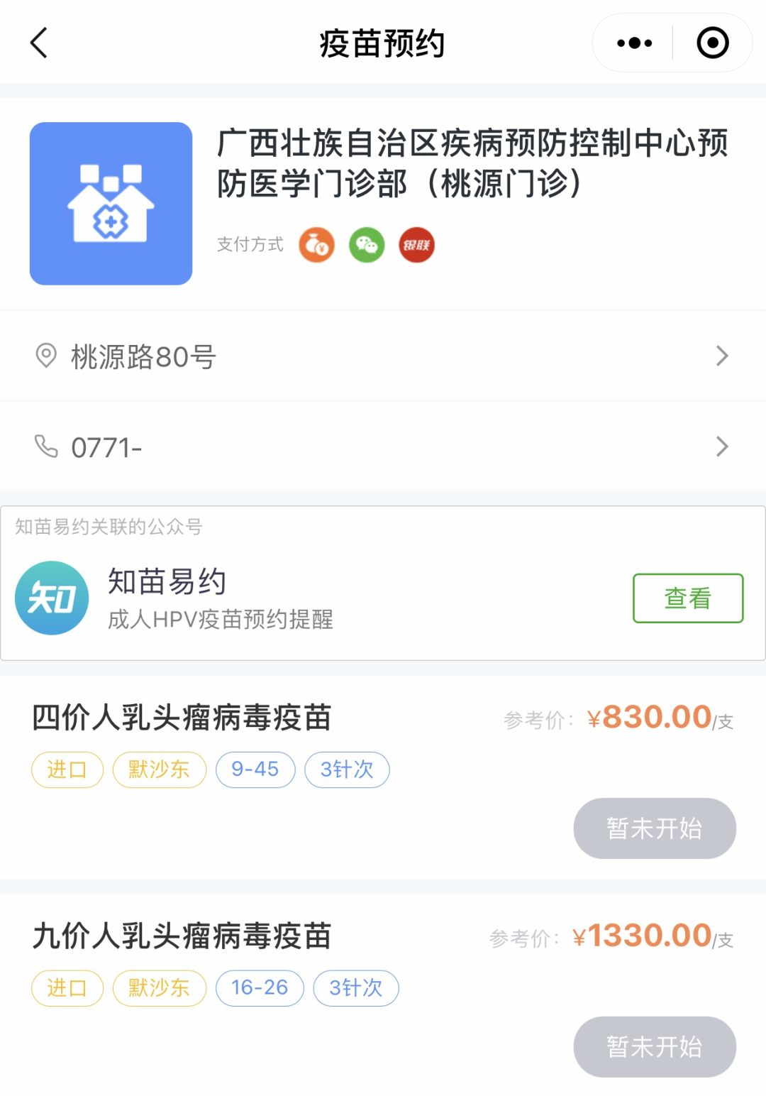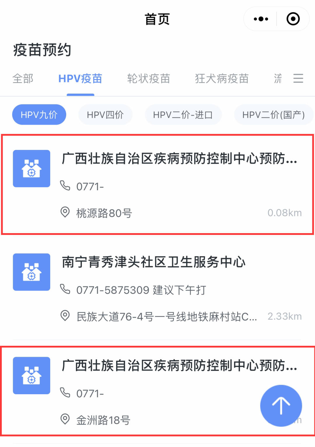 2.点击“HPV疫苗”找到“广西疾病预防控制中心门诊部”或者“广西疾病预防控制中心埌西门诊部”;