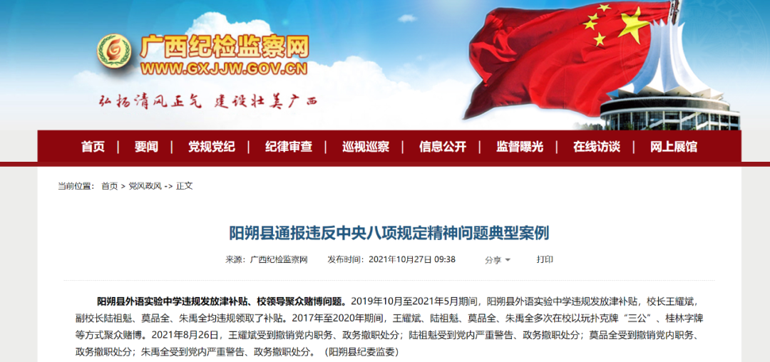 阳朔县外语实验中学违规发放津补贴、校领导聚众赌博问题。2019年10月至2021年5月期间,阳朔县外语实验中学违规发放津补贴,校长王耀斌,副校长陆祖魁、莫品全、朱禹全均违规领取了补贴。2017年至2020年期间,王耀斌、陆祖魁、莫品全、朱禹全多次在校以玩扑克牌“三公”、桂林字牌等方式聚众赌博。2021年8月26日,王耀斌受到撤销党内职务、政务撤职处分;陆祖魁受到党内严重警告、政务撤职处分;莫品全受到撤销党内职务、政务撤职处分;朱禹全受到党内严重警告、政务撤职处分。