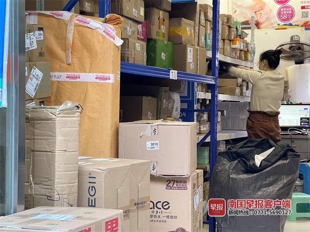 ▲南宁民族大道附近一小区,快递站工作人员整理货物。南国早报客户端记者 邹财麟 摄