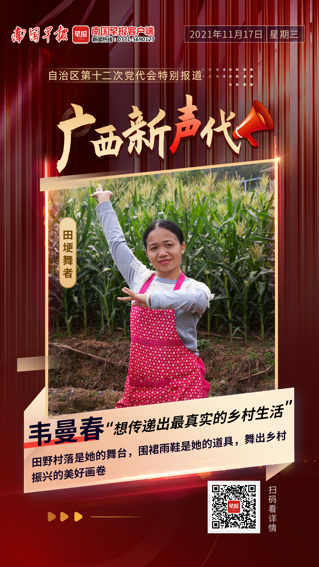 即日起,南国早报推出“广西新声代”系列人物采访,听他们畅谈生活和工作感受,讲述身边的新变化,以及对未来的憧憬。希望通过他们的故事,激励正在投身家乡建设的青年人,一起唱响“广西有我”的青春强音。今天,让我们来了解,“田埂上的舞者”韦曼春的故事。
