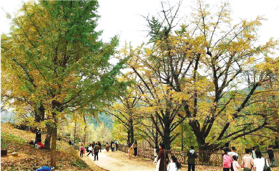 在村子的东北方向,数十棵银杏树组成了不规则的小树林。天气好时,银杏树似身披黄金甲;风吹过时,片片叶子沙沙作响,通体金黄树干呈现出如油画般质感,而树下厚厚一层叶子,如同金色地毯,格外惹眼。这些深秋里的精灵,演绎着这满城的金色浪漫,吸引着不少市民前来打卡。